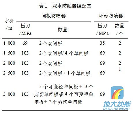 水下防噴器是海洋石油鉆采過(guò)程中用于防止井噴發(fā)生的專(zhuān)用設(shè)備,上部連接隔水管裝置,下部連接海底井口裝置。深水防噴器組通常有5個(gè)閘板和2個(gè)萬(wàn)能防噴器組成,第5個(gè)閘板即底閘板可以剪斷套管,套管剪切閘板位于盲板的下部,以便在剪斷套管后可以關(guān)井,通常在套管可能遇卡或者鉆井裝置需要應(yīng)急脫離時(shí)會(huì)用到。2個(gè)萬(wàn)能防噴器是冗余設(shè)計(jì)的需要,上部萬(wàn)能防噴器作為井控的主要手段。根據(jù)水深的不同,深水防噴器組通常有不同的配置。表1是在總結(jié)Transocean公司所有不同水深典型鉆井船防噴器組配置情況得出的,可以作為深水鉆井防噴器組配置的參考。 對(duì)于浮式鉆井裝置(半潛式平臺(tái)或鉆井船),選用防噴器系統(tǒng)的通徑為?476.3mm(工作水深<600m)或?425.5mm(工作水深>600m),選用封井壓力為69、103、138MPa時(shí),視工作水深、海底至目的層深度和是否為特殊高壓的油氣層而定。為了適應(yīng)欠平衡鉆井的需要,井口防噴器組合要配置高壓旋轉(zhuǎn)防噴器,即隨鉆壓力控制系統(tǒng)PCWD(Pres2sureControlWhileDrilling)。